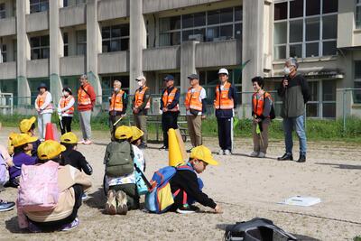 出かける前に、交通安全指導員の藤本さんと山﨑さんに横断歩道の渡り方について指導していただきました。