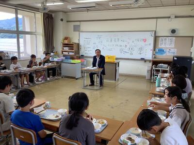 5月27日(月)に、5年B組の子どもたちが松浦弘幸町長と一緒に給食を食べました。とても楽しみにしていたのか、校長室へは4人でお迎えに来ました。