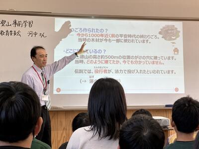 11月13日(水)に、5年生が三朝町教育委員会社会教育課の河中課長補佐をお招きし、三徳山登山に向けた事前学習を行いました。