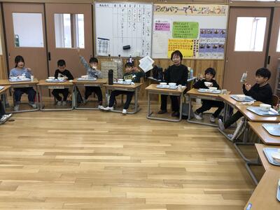 この期間中、本校でも様々な取組を行います。1月24日(金)は、給食食材の生産者の方をお招きし、一緒に給食を食べていただきました。