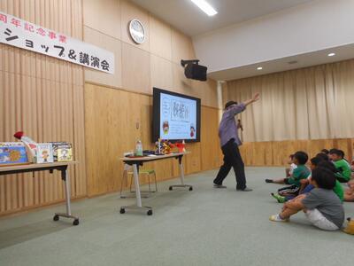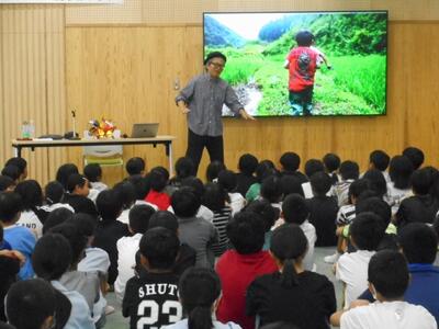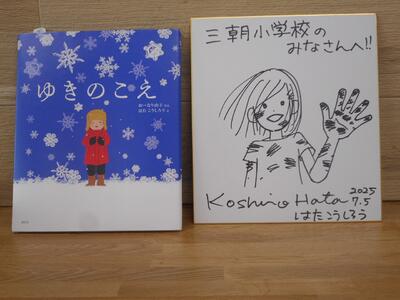 7月7日、絵本作家はたこうしろうさん講演会がありました。みささ図書館開館35周年記念事業の一環で、全校児童が絵本作家のはたこうしろうさんのお話を聞きました。