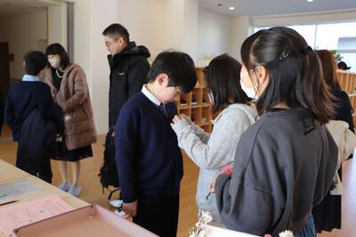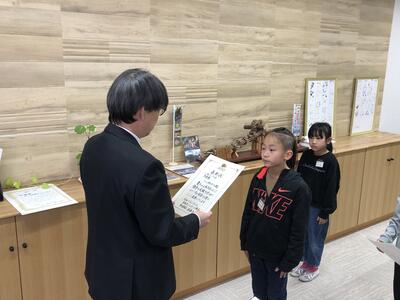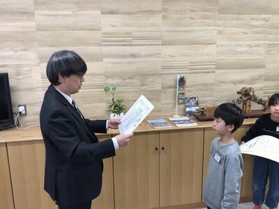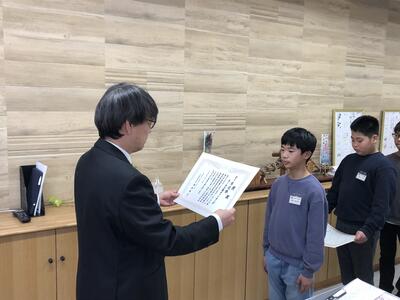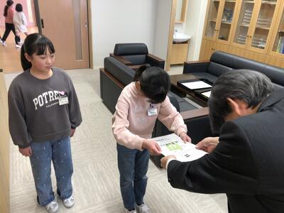 3月14日(金)、卒業式の全体練習の前に6年生の代表が校長室にやってきました。そして、完成した卒業文書と先生方へのメッセージを渡してくれました。