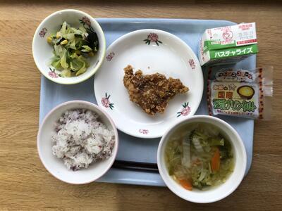 メニューは、うめごはん、牛乳、鶏のから揚げ、海藻サラダ、ABCスープ、プリンタルトでした。
