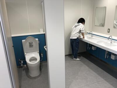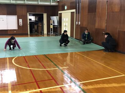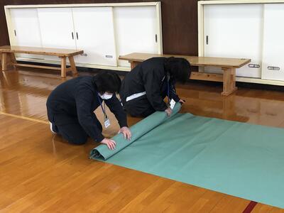 今回から会場の床全体にシートを敷くため、昼休憩に職員で準備しました。