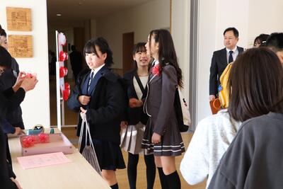 登校してきた卒業生は受付でリボンをつけ、教室に向かいました。