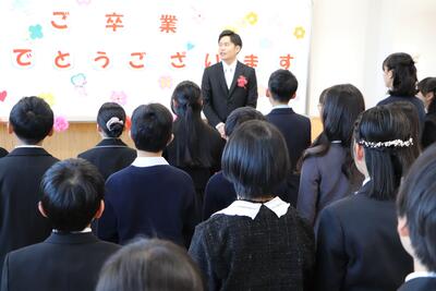 1183日もの長い間、学びを積み上げた卒業生のみなさん、ご卒業おめでとうございます。中学校でのさらなる飛躍を願っております。いつまでも応援しています。