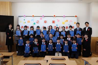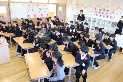 教室で担任の先生からの最後のお話を聞き、今まで育ててくださった保護者の方に感謝の気持ちを伝え、最後の記念撮影を行いました。