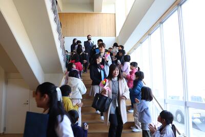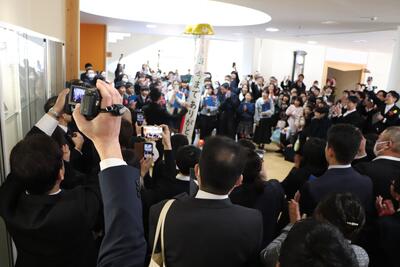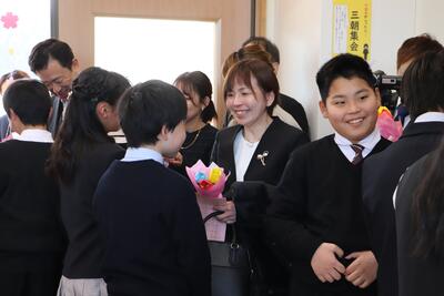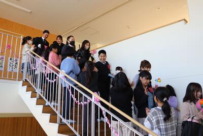 在校生がつくる花道を通り、みささっ子ホールで卒業生を見送りました。
