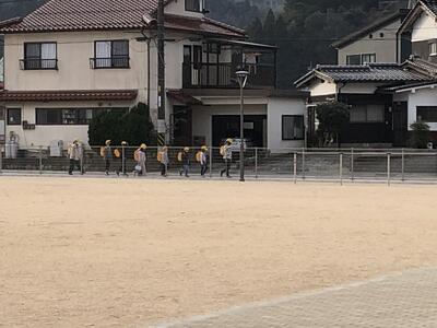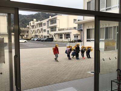 新しい班長での登校が始まっています。今日も一列になって子どもたちが登校してきました。