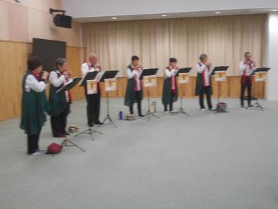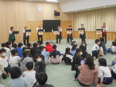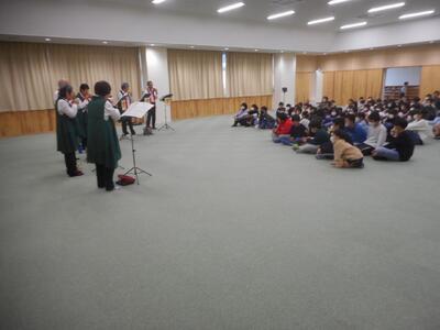 12月9日、オカリナ楽音(ラドン)さんによるミニコンサートがありました。オカリナ楽音さんは地元のオカリナ演奏グループで、今回初めて小学校でミニコンサートをしていただきました。曲は「さんぽ」や「君をのせて」等、児童がよく知っている曲を中心に演奏していただきました。オカリナの素敵な音色がホールに響き渡る素敵なミニコンサートでした。来週も来ていただくことになっており、とても楽しみです。