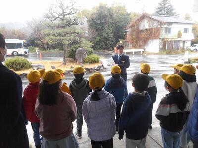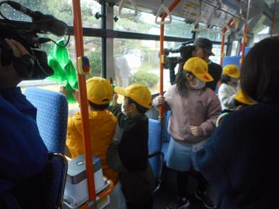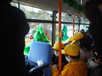 はじめに、バスの正しい乗り降りについて教えていただきました。その後、準備していた飾りを車内にラッピングしました。