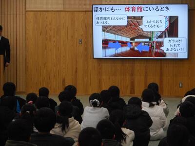 始業式終了後、安全担当者より、学校で地震が発生したときの避難の仕方等について、再度全校で確認しました。