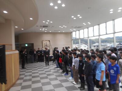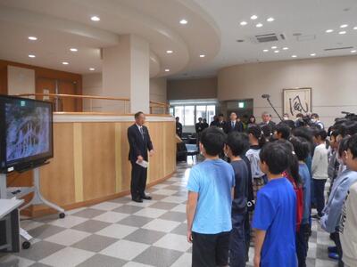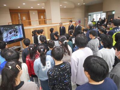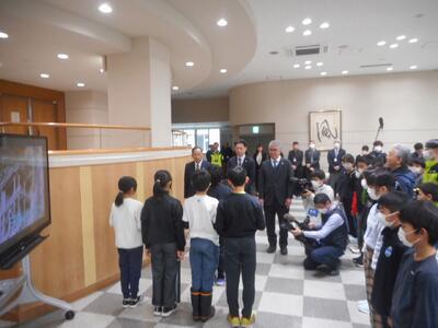 併せて、このパンフレットを日本遺産のPRに活用していただこうと三朝町へ贈呈することとし、5年生全員で町長さんをはじめ副町長さん、教育長さんへお渡ししました。