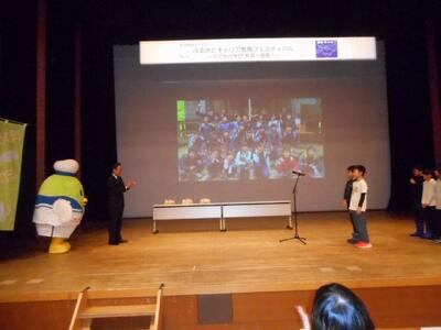 1月31日、5年生「三徳レンジャーズ」が、鳥取県教育委員会主催「ふるさとキャリア教育CMコンテスト」においてCM賞を受賞し、表彰式がエースパック未来中心で行われ出席しました。